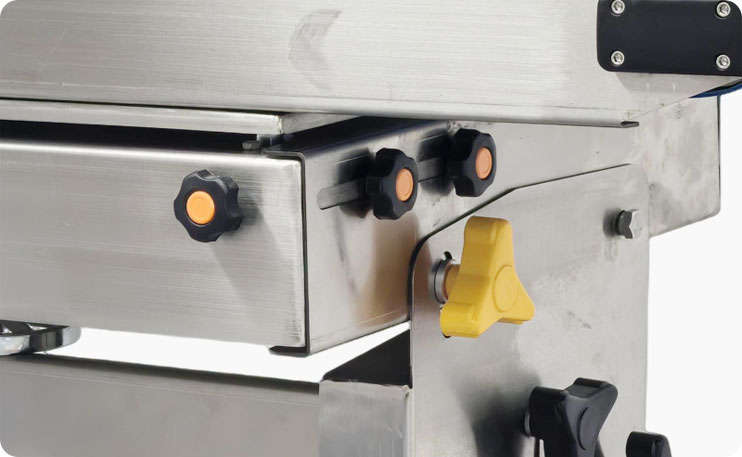 La posición de la mesa transportadora se puede ajustar hacia adelante, hacia atrás, hacia arriba y hacia abajo, y también se puede ajustar según el tamaño del producto.