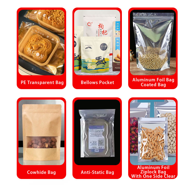 Esta máquina es adecuada para sellar diversos tipos de bolsas termosellables, incluyendo bolsas de aluminio, bolsas de plástico, bolsas compuestas, papel kraft, bolsas de conservación de alimentos, bolsitas de té y film retráctil. Ofrece un sellado seguro y una alta eficiencia, lo que la hace ampliamente utilizada en industrias como la alimentaria, farmacéutica, química, agrícola y de aceites lubricantes.